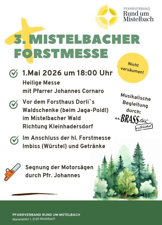 Herzliche Einladung zur 3. Mistelbacher Forstmesse am 1.Mai 2026 um 18:00 vor dem Forsthaus Dorlis`s Waldschenke im Mistelbacher Wald, Richtung Kleinhadersdorf.
