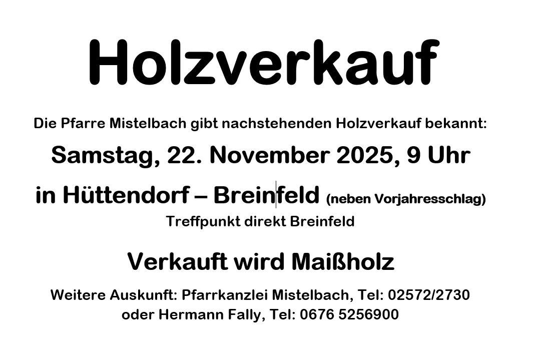 Holzverkauf der Pfarre Mistelbach + zum Google Calendar hinzufügen + iCal / Outlook export Datum 22.Nov..2025 Uhrzeit 9:00 Ort Hüttendorf - Breinfeld Kategorie Hüttendorf Mistelbach Paasdorf Pfarrverband Diese Veranstaltung teilen