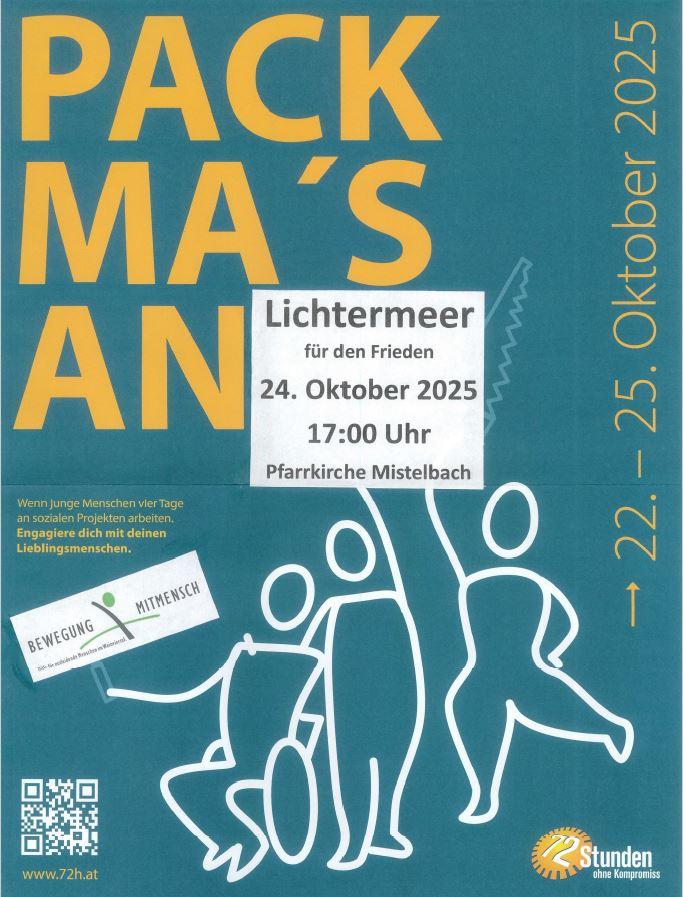 Lichtermeer für den Frieden + zum Google Calendar hinzufügen + iCal / Outlook export Datum 24.Okt..2025 Uhrzeit 17:00 Ort Stadtpfarrkirche Mistelbach Hochgasse, 2130 Mistelbach Kategorie Bullendorf Eibesthal Frättingsdorf Hörersdorf Hüttendorf Kettlasbrunn Mistelbach Paasdorf Pfarrverband Siebenhirten Wilfersdorf Diese Veranstaltung teilen