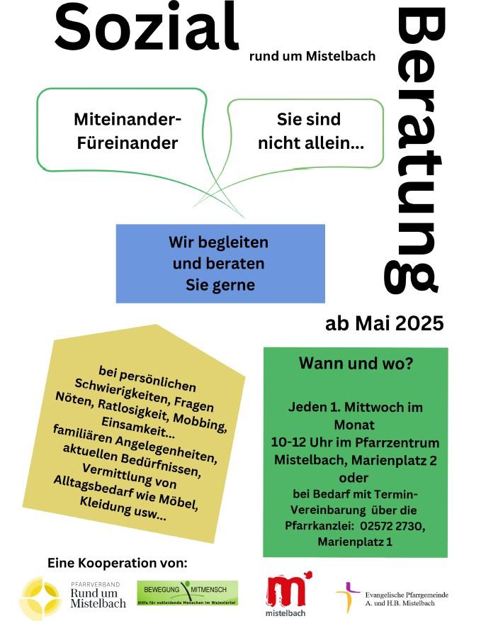Sozialberatung + zum Google Calendar hinzufügen + iCal / Outlook export Datum 04.März.2026 Uhrzeit 10:00 - 12:00 Ort Pfarrzentrum Mistelbach Kategorie Bullendorf Eibesthal Frättingsdorf Hörersdorf Hüttendorf Kettlasbrunn Mistelbach Paasdorf Pfarrverband Siebenhirten Wilfersdorf Diese Veranstaltung teilen