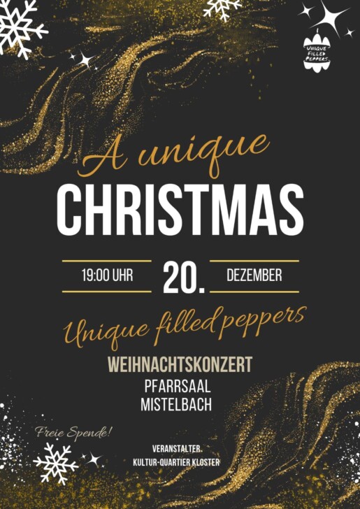 Die Weinviertler Band Unique Filled Peppers lädt gemeinsam mit dem Verein Kultur-Quartier-Kloster am Samstag, 20. Dezember 2025, zu einem stimmungsvollen Weihnachtskonzert in den Pfarrsaal Mistelbach. Ab 19:00 Uhr präsentiert die Band ihr Programm “A
